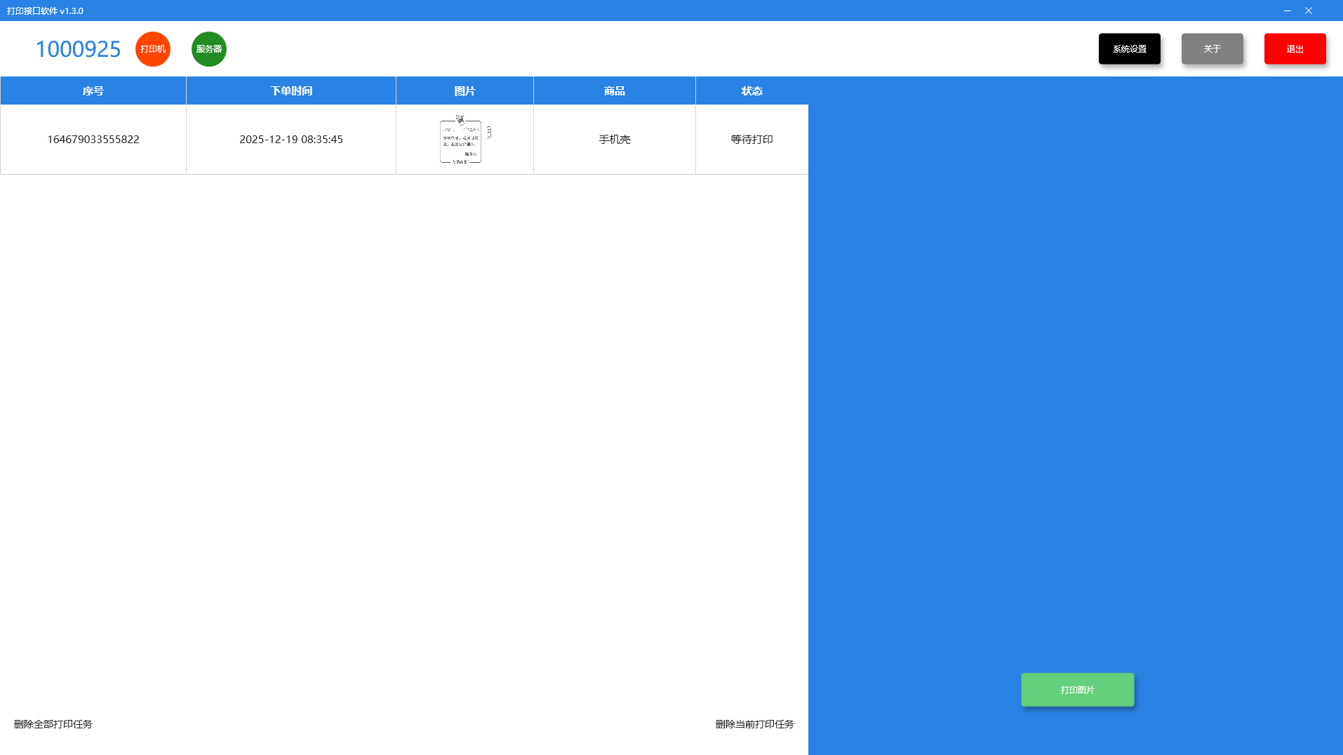 # 一、软件介绍 > 互联网桌面版客户端软件通过安全稳定的HTTPS连接,将打印设备转化为可远程调度的网络节点。其订单管理、远程控制和状态回调三大核心能力,共同构成了一个完整的远程生产管控解决方案,旨在帮助用户提升运营效率、降低管理成本并实现业务流程的数字化整合 软件本质上是一个连接本地设备与云端服务的桥梁。它通过标准的HTTPS协议,将分布在各处的打印设备安全、可靠地接入互联网,实现远程管理与智能调度。 其核心价值在于: **功能在线化:**让传统上只能本地操作的打印设备具备远程接收任务、上报状态的能力。 **管理集中化:**用户或管理员可以在任何有网络的地方,通过一个中心界面监控和管理所有在线设备。 **流程自动化:**通过与业务系统(如电商平台、ERP系统)对接,实现从订单产生到成品输出的全自动化流程。 **软件界面:**  # 二、核心功能 ###(一)首次登录 1、打开互联网客户端软件:【双击】桌面软件图标或【右键】点击图标 → 选择【打开】,出现绑定设备弹框。 2、绑定设备登录软件:输入打印机背后二维码下【数字编号】,点击【绑定】按钮,进入到软件首页。 ###(二)接口调用 具体说明关注互联网接口- 瑞丰彩开放平台:https://www.colorpark.cn/admin/guide/document?id=11 | 接口分类 | 接口名 | | ---- | ---- | | 订单接口 | [发送打印任务](https://colorpark.cn/admin/guide/document?id=1 "发送打印任务") | | 订单接口 | [开始打印任务【二次确认】](https://colorpark.cn/admin/guide/document?id=3 "开始打印任务【二次确认】") | | 订单接口 | [取消指定打印任务](https://colorpark.cn/admin/guide/document?id=4 "取消指定打印任务") | | 远程接口 | [远程清洗喷头](https://colorpark.cn/admin/guide/document?id=40 "远程清洗喷头") | | 远程接口 | [远程关机](https://colorpark.cn/admin/guide/document?id=41 "远程关机") | | 远程接口 | [远程重启](https://colorpark.cn/admin/guide/document?id=42 "远程重启") | | 查询接口 | [查询指定打印任务](https://colorpark.cn/admin/guide/document?id=2 "查询指定打印任务") | | 查询接口 | [查询所有打印任务](https://colorpark.cn/admin/guide/document?id=43 "查询所有打印任务") | | 查询接口 | [查询库存信息](https://colorpark.cn/admin/guide/document?id=45 "查询库存信息") | | 查询接口 | [查询打印机状态](https://colorpark.cn/admin/guide/document?id=46 "查询打印机状态") | | 查询接口 | [查询待打印任务数量](https://colorpark.cn/admin/guide/document?id=47 "查询待打印任务数量") | | 查询接口 | [查询指定打印任务排序](https://colorpark.cn/admin/guide/document?id=48 "查询指定打印任务排序") | | 查询接口 | [查询指定任务前排位订单](https://colorpark.cn/admin/guide/document?id=49 "查询指定任务前排位订单") | | 查询接口 | [查询墨量](https://colorpark.cn/admin/guide/document?id=65 "查询墨量") | | 回调 | [打印任务回调](https://colorpark.cn/admin/guide/document?id=22 "打印任务回调") | | 回调 | [打印机状态回调](https://colorpark.cn/admin/guide/document?id=38 "打印机状态回调") | ###(三)功能介绍 | 功能 | 简介 | 图片 | | ------------ | ------------ | ------------ | | | 操作【设置】→【系统设置】打开多功能弹框可操作相应功能 | | | **1)选择打印模式-手动打印** | 需用户手动选择订单点击【打印】按钮进行打印,打印时长与动作灵活控制。|  | | **1)选择打印模式-接口打印** | 需调用【开始打印任务二次确认】打印接口进行打印,打印时长灵活控制,不需要手动点击。 |  | | **1)选择打印模式-循环打印** | 设置订单之间固定等待时长,预留上下架耗材时间且实现自动打印。 |  | | **2) 播放视频** | 点击右上角【设置】→【系统设置】→打开多功能弹框,选择【播放视频】,将自动切换播放存储在“C:\WPFColorcloudCommon\video\video.mp4”路径下视频文件,可根据自身需求手动更换。 |   | | **3) 清洗喷头** | 应用于打印出现色差或阻塞情况,保证喷头处于正常喷墨状态,保障打印质量稳定,延长喷头使用寿命。点击右上角【设置】→【系统设置】→打开多功能弹框,选择【喷头清洗】→【清洗喷头】,等待约40秒可清洗完成,开启软件后会自动清洗一次,清洗期间建议不做打印操作。 | | | **4) 色块打印** | 为检测产品打印的质量,可提前打印色块查看是否有缺失且精度不准情况,若出现色块问题可尝试清洗喷头。点击右上角【设置】→【系统设置】→打开多功能弹框,选择【色块打印】→【确认打印】,软件将色块图片自动转换为tif格式文件传输到打印机软件中打印。 | | | **5) 打印线框** | 原点位置默认为右下角横轴与纵轴的相交点,以打印机面对治具的视角来看,耗材与治具的左边距离为左边距(left),耗材与治具的上边距离为上边距(top)。点击右上角【设置】→【系统设置】→打开多功能弹框,选择【打印线框】→【确认打印】用于测量当前打印机的起始点或原点位置,线框横轴与纵轴的相交点为原点,软件打印线框的相交点与实际原点的左边距、上边距为10mm,用户可根据数值来判定实际原点位置。 | | | **6) 切换语言** | 启动软件,可根据使用习惯切换界面文字语言显示,点击右上角【设置】→【系统设置】→打开多功能弹框,选择【语言切换】→选择使用语言,点击【确定】保存配置,目前支持English、简体中文、繁體中文三种语言切换。 | | | **7) 缩小窗体** | 点击右上角【设置】→【系统设置】→打开多功能弹框,选