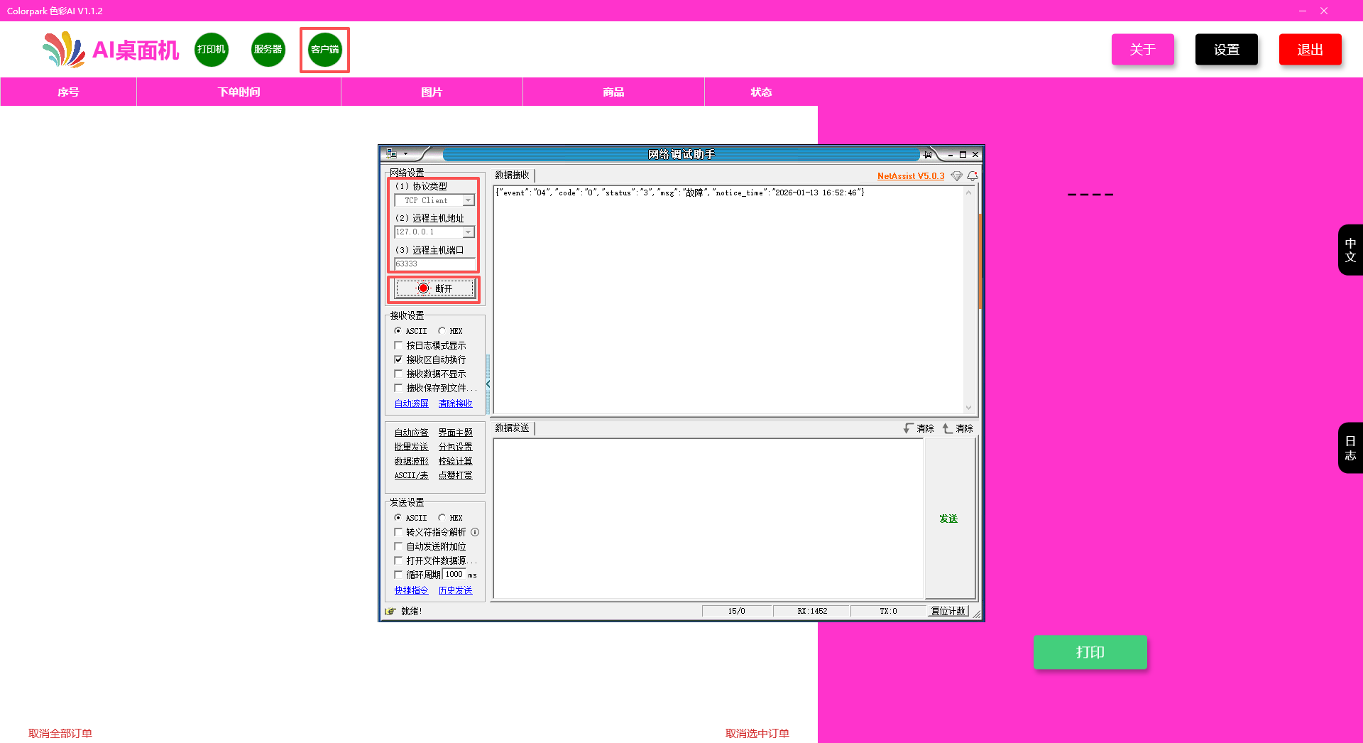 # 一、软件简介 TCP客户端软件是一款专为单机环境下设备与远程服务器进行可靠数据交互而设计的专用工具。它基于TCP协议,确保了数据传输的稳定性与准确性,适应不同屏幕尺寸。 **终端软件主体界面:**  # 二、核心功能 ###(一)接口调用 **1) 连接客户端** 建立“客户端-服务器”模型,通信双方的IP都指向本机,连接方式详情如下: | 参数名 | 参数名 | 参数说明 | | ------------ | ------------ | ------------ | | IP | 127.0.0.1 | 局域网内使用对应的IP | | 端口 | 63333 | 固定的端口 | | 连接方式 | TCP | 采用TCP的长连接方式 | | 编码格式 | UTF8 | 收发数据全部采用UTF8编码 | | 数据格式 | json | 数据发送与接收都采用Json格式 |  **2) 接口调用** **调用前提:** 1、确认图片打印尺寸(宽度、高度) 2、完成打印位置测量(从打印机面对治具的视角看,左上角为原点到物品的距离,测量左边距与上边距距离) **核心接口包括以下接口:** - [1、发送心跳包事件](https://colorpark.cn/admin/guide/document?id=26 "发送心跳包事件") - [2、创建打印任务](https://colorpark.cn/admin/guide/document?id=27 "创建打印任务") - [3、取消打印任务](https://colorpark.cn/admin/guide/document?id=28 "取消打印任务") - [4、打印任务状态回调事件](https://colorpark.cn/admin/guide/document?id=29 "打印任务状态回调事件") - [5、打印机状态回调事件](https://colorpark.cn/admin/guide/document?id=30 "打印机状态回调事件") - [6、打印机缺墨回调事件](https://colorpark.cn/admin/guide/document?id=31 "打印机缺墨回调事件") 具体说明关注TCP接口- 瑞丰彩开放平台:https://www.colorpark.cn/admin/guide/document?id=32 ###(二)功能介绍 | 功能 | 简介 | 图片 | | ------------ | ------------ | ------------ | | | 操作【设置】→【系统设置】打开多功能弹框可操作相应功能 | | | **1) 订单打印** | 建立客户端连接订单创建之后,手动点击【打印】按钮对订单进行打印,图片将以tif格式转输到打印机软件进行打印。|  | | **2) 设置旋转角度** | 逆时针旋转:打印区域右侧向下倾斜,需要向上旋转,角度填写负数。顺时针旋转:打印区域右侧向上倾斜,需要向下旋转,角度填写正数。(默认角度为0,若产品测试打印有倾斜再根据实际情况下进行调整)|  | | **3) 选择语言** | 启动软件,可根据使用习惯切换界面文字语言显示,点击右侧【中文】→弹框中选择不同语言,点击【确定】保存配置,目前支持English、简体中文、繁體中文三种语言切换。|  | | **4) 版本说明** | 启动软件,点击【关于】可查看软件当前版本号,方便与服务商核对更新功能。|  | | **5) 日志** | 日志中记录本次启动后所有操作日志、(服务器、打印机、客户端)连接状态、故障信息,方便使用方查阅与排查问题。|  | # 二、快速入门 ### (一)适用支持 适用对象:本手册适用于所有使用瑞丰彩TCP桌面版客户端软件的所有用户。 支持渠道:若使用过程中遇到问题,可通过以下方式获取帮助: > 进入开放平台文档查阅:https://www.colorpark.cn/admin/login/login 社群支持:微信群【联系销售人员】 联系电话:137-5177-4454【微信同号】 官方邮箱:info@ColorPark.cn ### (二)相关插件 1)、NET Framework 4.8.1框架包适用于 x86 和 x64 架构的 Windows 系统: NDP481-x86-x64-AllOS-ENU.zip 或进入官网下载:https://dotnet.microsoft.com/zh-cn/download/dotnet-framework/net481 2)、打印机软件PrintExp:PrintExp_N10_29_CN_20240801.zip 3)、客户端软件:WPFTcpCoinAiDesktop.exe 4)、开机自启动设置文件:start.bat ###(三)环境要求 在安装软件前,请确保设备满足以下系统要求,避免因环境不兼容导致软件无法正常运行。 | 环境类型 | 最低配置 | 参数说明 | | ------------ | ------------ | ------------ | | 操作系统 | Windows 10及以上 X64位 | Windows 11 X64位 | | 处理器 | Intel i3 或以上性能处理器 | Intel i3或以上性能处理器 | | 内存 | 8GB RAM | 8GB RAM及以上 | | 安装盘存储空间 | 至少10GB可用空间 | 20GB及以上可用空间 | | WIFI类型 | 支持WiFi4及以上 | 支持WiFi5及以上 | | 登录账户身份 | 不限 | Administrator | | 其他要求 | 打印机网络连接正常、本地网络连接正常、安装管理员权限 |稳定网络环境、固态硬盘(256G) | | 内存 | 8GB RAM | 8GB RAM及以上 | ###(四)环境配置 **1) 检查是否已关闭防火墙** 点击左下角【程序】,输入【控制面板】点击打开 > 选择【系统和安全】 >【Windows Defender 防火墙】 > 【启用或关闭Windows Defender 防火墙】,在“专用网络”和“公用网络”下选择【关闭Windows Defender防火墙】,点击【确定】。  **2) 检查退出并卸载杀毒软件** **通过控制面板卸载:** 1) 打开控制面板(Windows 10/11:右键【开始】菜单 → 选择【设置】→ 【应用】或【程序和功能】)。 2) 在程序列表中找到目标杀毒软件(如“360安全卫士”“瑞星”等),点击【卸载/更改】按钮。 3) 按提示完成卸载向导,务必勾选【删除用户配置文件】等选项避免残留。 **3) 安装打印机软件** **安装打印机软件:** 1) 打开PrintExp安装包,双击exe文件 → 点击“下一步” → 点击“安装” → 点击“完成” → 弹出“微软常用运行库合集”弹框,点击“下一步” → 点击下一步 → 点击“结束”。 **4) 配置打印机网络** 1) 点击右下角网络图标 → 更改适配器选项 → 选择“以太网/以太网4”(提示无法访问internet) → 右键选择“属性” → 双击Internet协议版本4 (TCP/IPv4)出现属性配置弹框,按以下内容进行配置: > IP:192.168.127.11 子网掩码:255.255.255.0 默认网关:192.168.127