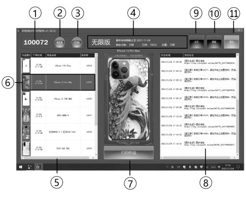 ## 云打印 云打印,以互联网为基础,结合打印机资源,构建共享的打印平台,向用户提供高度定制化的打印服务。通过手机端上传写成打印的图片文件,即可通过对指定设备打印,不再受距离、时间的限制,操作简单高效便捷。 **通过 “ UV打印机 + 互联网 ” 实现专属的打印业务场景服务,让打印产生无限可能**  云打印服务主要包括:**定制端、运营端,客户端、打印机** **打印机**是指是最终的实现打印的UV打印设备,云打印打印设备,而且整机、外观也做了深度定制化,可满足具体场景业务功能,具有高集成、高稳定、低故障等特色。 通过 “ UV打印机 + 互联网 ” 实现专属的打印业务场景服务,让打印产生无限可能 ## 设备参数 | 设备图片 | 结构图 | | :------------: | :------------: | |  | | |描述|说明| | ------------ | ------------ | | 打印喷头 | 爱普生 XP600 | | 打印方式 | 4色单喷头 按需喷墨| | 色彩模式 | C青 . M品红 . Y黄 . K黑 | | 墨水容量 | UV墨水250ml x 4 | | 打印速度 | 2分钟 / 个 | | 适用手机 | 硅胶、TPU、软胶、塑胶、皮革、亚克力、金属 | | 喷头保护 | 自动清洗 / 手动清洗 | | 触控电脑 | 10.1英寸,1920 x 1200 IPS屏,四核1.92Ghz| | 机器尺寸 | 60cm x 47cm x 42.5cm | | 包装尺寸 | 70cm x 54cm x 51cm | | 净重/毛重 | 33kg / 46kg | | 包装方式 | 纸箱 | | 电压要求 | 50/60HZ 220V(±10%) 110V(±10%) | | 设备功率 | 40W / 150W | | 运行环境 | 20-28℃(68-82℉)HR40-60% | | 供墨方式 | 专用墨管 + 墨瓶供墨 | | 操作软件 | PrintEXP + 客户端 + 小程序 | ## 外观介绍 ### 正背面 |正面|背面| | ------------| ------------ | | |  | |描述|说明| | ------------| ------------ | | ① 功能按键 | 使用说明参考“前置按键”说明 | | ② 物料平台 | 将需要打印的物料放置在此平台 | | ② 二维码 | 打印机二维码,扫码即可开启定制 | | ④ 触控电脑 | 高性能桌面式盒式电脑 | | ⑤ 电源接口 | 支持 220V(±10%) ,110V(±10%) | | ⑥ 电源开关 | 打印机总开关 | | ⑦ 通风散热 | 持续作业通风口 | | ⑧ 电源散热 | 持续作业通风口 | ### 两侧面 开启顶盖挡板后可对打印机进行添墨操作; |左侧面|右侧面| | ------------| ------------ | |  || ### 前置按键 |前置按键图片| | :------------: | |  | |描述|说明| | ------------| ------------ | | ① NOZZLE | 打印机器喷嘴检测 | | ② PAUSE | 当打印机打印时按下可暂停打印 | | ③ CLEAN | 按下后给喷头进行清洗 | | ④ L | 控制平台向左移动 | | ⑤ OUT | 控制平台向前移动 | | ⑥ DOWN | 备用按钮 | | ⑦ IN | 控制平台向后移动 | | ⑧ R | 控制平台向右移动 | | ⑨ UP | 备用按钮 | ## 软件介绍 |软件介绍图片| | :------------: | |  | |描述|说明| | ------------| ------------ | | ① 打印机编号 | 识别打印机编号 | | ② 服务器状态 | 显示设备连接服务器状态 绿色:设备联网成功 红色:设备未联网 | | ③ 打印机状态 | 显示设备连接打印机状态 绿色:设备连接打印机成功 红色:设备未连接打印机 | | ④ 版本信息 | 打印机套装版本及打印数量信息 | | ⑤ 订单列表 | 待打印的订单列表,长按可取消打印; | | ⑥ 打印订单 | 正打印的订单作品 | | ⑦ 开始打印 | 选中订单列表可开启打印 | | ⑧ 日志列表 | 打印的日志清单 | | ⑨ 关于 | 关于客户端信息 | | ⑩ 语言 | 切换中繁英 | | ⑪ 退出 | 退出客户端 | ## 操作介绍 ### 打开包装 |打开包装图片| | :------------: | | | ||||| | ------------| ------------ |------------|------------| | 限位器 | 电源 |螺丝刀|针筒| ### 拆箱指导 |错误示范|正确示范| | ------------| ------------ | |  | | | 禁止将包装(木箱或纸箱)倾斜或者侧翻取出机器 | 拆除包装后,按图示将机器从顶部正向抬出 | ### 搬运指导 |错误示范|正确示范| | ------------| ------------ | | | | | 抬起机器时,禁止抬握图示平台部位 | 抬起机器时,请握住图示标明的部位 | ### 安置机器 |描述|说明| | ------------| ------------ | | 请将机器放置于满足下列规格的桌子 1、桌子尺寸 ≥ 机器尺寸 2、桌子高度 ≥ 70CM 3、正、背面 ≥ 30CM|  | ### 拆除支架 |描述|说明| | ------------| ------------ | | 第一步:打开顶部盖板;第二步:使用螺丝刀拆除1所示固定支架;第三步:使用螺丝刀拆除2所示固定支架;|  | ### 机器通电 |描述|说明| | ------------| ------------ | | 1、接上网线和电源线,按下总开关 |  | ### 物理装墨 |描述|说明| | ------------| ------------ | | | | | 打开打印机左侧挡板 | 将墨水按对应颜色依次倒入墨盒 | ### 启动电脑 |描述|说明| | ------------| ------------ | | 1、打开打印机顶部盖板 2、在盖板背面电脑右侧区域长按直至电脑正常启动 3、电脑启动成功后设置连接可用的WiFI | | ### 系统装墨 |描述|说明| | ------------| ------------ | | 1、打开打印机软件设置界面。2、点击“装墨”等待30秒,在弹出窗点击“停止”等待5秒,再点“装墨”等待10秒,点停止即可; | | ### 清洗喷头 |描述|说明| | ------------| ------------ | | 1、在“前置按键”按“清洗喷头”按键,重复清洗两次 | | ### 喷嘴检测 |描述|说明| | ------------| ------------ | | 1、找一张纸平整放置在平台,按一下前置按键的“Nozzle按键” || ### 扫码定制 |描述|说明| | ------------| ------------ | | 打开微信或者带有扫码功能的APP(如浏览器),扫描机器正面右上角二维码,在打开的小程序或H5开始定制,并生成订单;| | ### 人工放料 |描述|说明| | ------------| ------------ | | 选取打印的物料置于平台,并保持物料平整(打印手机壳需将摄像头朝向固定于平