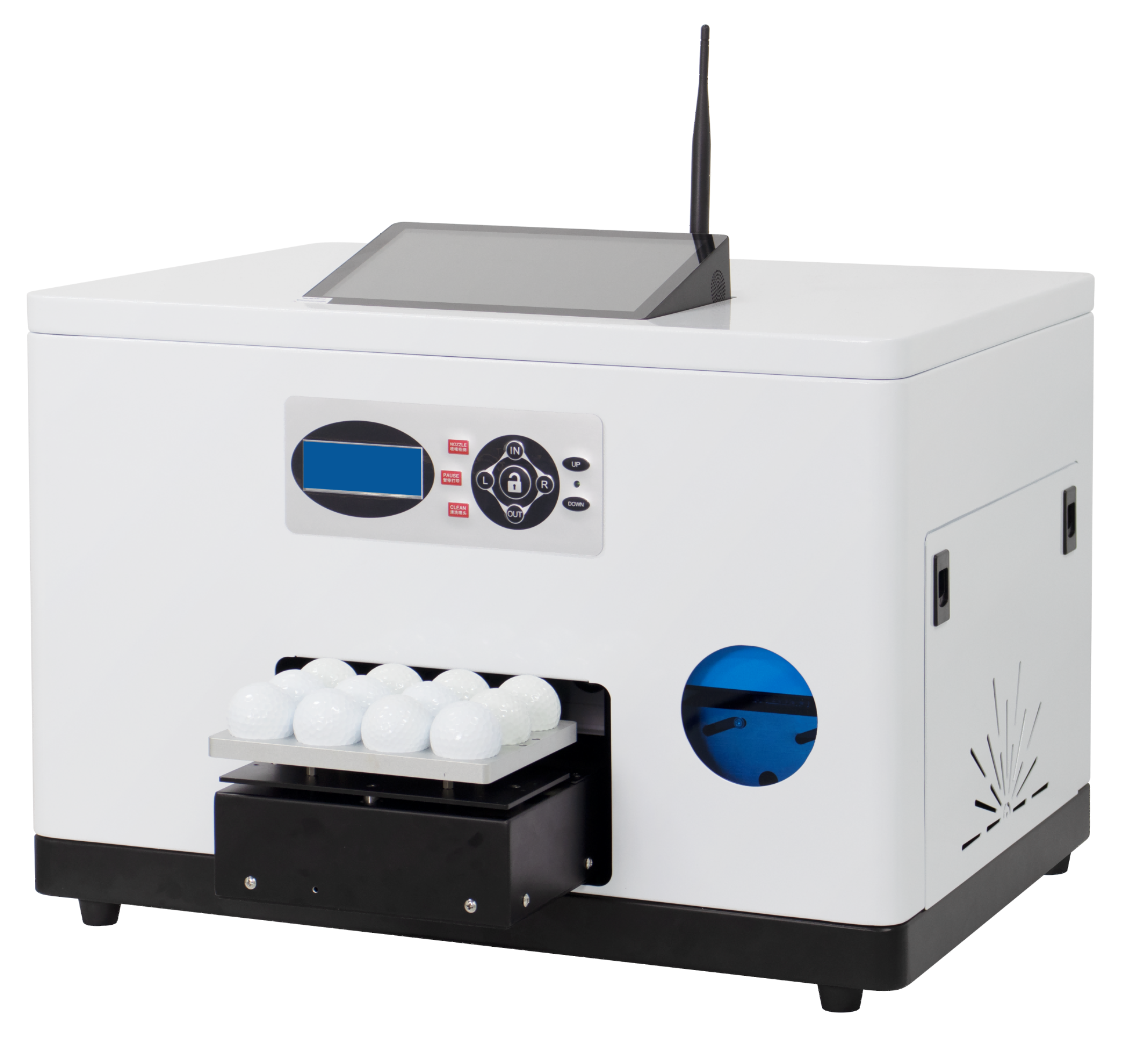 > 专机专用 · 高尔夫球定制 · 精准定位 --- ## 目录 1. [欢迎使用](#欢迎使用) 2. [开箱检查](#开箱检查) 3. [放置机器](#放置机器) 4. [首次安装](#首次安装) 5. [开始打印](#开始打印) 6. [高尔夫球打印技巧](#高尔夫球打印技巧) 7. [日常维护](#日常维护) 8. [注意事项](#注意事项) 9. [常见问题 FAQ](#常见问题-faq) 10. [获取帮助](#获取帮助) --- ## 欢迎使用 感谢您选择瑞丰彩高尔夫球桌面打印机! 这是一台**专门打印高尔夫球**的 UV 打印机——支持各种高尔夫球的个性化定制,高清彩印、色彩鲜艳、耐磨耐打,是球场、俱乐部、赛事活动的理想选择。 > **本说明书适合谁看?** > - ✅ 第一次使用高尔夫球打印机的新手 > - ✅ 刚收到设备,不知道如何开箱安装 > - ✅ 想了解基本操作和日常维护 **阅读建议:** 按顺序阅读,第一次使用时对照步骤操作。  --- ## 开箱检查 ### 1. 检查包装 收到设备后,先检查外包装是否完好: - ✅ 纸箱无破损 - ✅ 无倾斜、倒置痕迹 - ✅ 封条完整 > ⚠️ **如发现包装破损,请先拍照并联系售后,再开箱!** ### 2. 正确开箱 **错误做法 ❌** - 将包装箱倾斜或侧翻取出机器 - 直接推拉机器 **正确做法 ✅** - 拆除包装后,从顶部正向抬出机器 - 两人配合,握住指定部位(见下图) |错误示范|正确示范| | ------------| ------------ | |  |  | | 禁止将包装(木箱或纸箱)倾斜或者侧翻取出机器 | 拆除包装后,按图示将机器从顶部正向抬出 | ### 3. 检查配件 开箱后,检查以下配件是否齐全: | 配件 | 数量 | 用途 | |------|------|------| | 限位器 | 1 个 | 固定高尔夫球位置 | | 电源线 | 1 根 | 连接电源 | | 螺丝刀 | 1 把 | 拆除固定支架 | | 针筒 | 1 个 | 抽取墨水 | | 墨水 | 4 瓶 | CMYK 四色 UV 墨水 | | 球座治具 | 1 套 | 固定高尔夫球专用治具 | |||||| | ------------| ------------ |------------|------------| | 墨水 | 电源线 | 网线 | 用户手册 | 配件包 | ### 4. 检查机器外观 检查机器是否有运输损伤: - ✅ 机身无划痕、凹陷 - ✅ 屏幕无裂纹 - ✅ 按键完好 - ✅ 平台移动顺畅 --- ## 放置机器 ### 1. 选择合适的桌子 **桌子要求:** | 要求 | 说明 | |------|------| | **尺寸** | ≥ 机器尺寸(60cm × 47cm) | | **高度** | ≥ 70cm | | **稳固性** | 牢固、不晃动 | | **空间** | 正面、背面各预留 ≥ 30cm 空间 |  ### 2. 正确搬运 **错误做法 ❌** - 抬握平台部位(会损坏平台) **正确做法 ✅** - 握住机身两侧指定部位(见下图) - 两人配合,平稳抬起  ### 3. 环境要求 | 项目 | 要求 | |------|------| | **温度** | 20-28℃(68-82℉) | | **湿度** | 40-60% | | **避免** | 阳光直射、温度差大的地方 | | **地面** | 平整、稳固 | --- ## 首次安装 ### 第一步:拆除固定支架 机器在运输过程中有支架固定,使用前需要拆除: 1. **打开顶部盖板** 2. **用螺丝刀拆除固定支架 1** 3. **用剪刀剔除扎带 2**  ### 第二步:安装墨水 **墨水颜色:** C 青、M 品红、Y 黄、K 黑(共 4 色) **操作步骤:** 1. **打开打印机左侧挡板** 2. **找到墨盒位置** 3. **按对应颜色依次倒入墨水**(注意不要倒错) > ⚠️ **注意:** > - 墨水颜色要与墨盒标识对应 > - 倒墨水时缓慢倒入,避免溢出 > - 建议戴手套操作  ### 第三步:连接电源 1. **连接电源线** — 插入机器背面电源接口 2. **按下总开关** — 打开机器电源  ### 第四步:启动电脑 1. **打开打印机顶部盖板** 2. **找到电脑电源键**(盖板背面右侧区域) 3. **长按电源键**直至电脑启动 4. **连接 WiFi** — 电脑启动后,连接可用的 WiFi 网络  ### 第五步:系统装墨 首次使用需要让墨水充满管道: 1. **打开打印机软件**(PrintEXP) 2. **进入设置界面** 3. **点击"装墨"**,等待 30 秒 4. **点击"停止"**,等待 5 秒 5. **再次点击"装墨"**,等待 10 秒 6. **点击"停止"**,完成装墨  > ⚠️ **注意:** 装墨过程不要断电 ### 第六步:清洗喷头 1. **找到前置按键面板** 2. **按"CLEAN"键**(清洗喷头) 3. **重复清洗 2 次**  ### 第七步:喷嘴检测 检测喷头是否正常工作: 1. **找一张白纸**,平整放置在平台上 2. **按"NOZZLE"键**(喷嘴检测) 3. **检查打印出的线条**是否完整、无断线 > ✅ **正常:** 线条连续、无断线 > ❌ **异常:** 线条有断点、缺失 → 需要再次清洗喷头  --- ## 开始打印 ### 完整打印流程 ``` 扫码 → 选图案 → 下单 → 放高尔夫球 → 打印 → 取货 ``` ### 步骤 1:扫码进入 1. 打开微信或浏览器 2. 扫描机器正面右上角的二维码 3. 进入小程序/H5 页面 > **![扫码位置图]** *(此处放置二维码位置标注图)* ### 步骤 2:选择图案 在小程序中: 1. 浏览模板库或上传自己的图案 2. 选择高尔夫球规格(标准尺寸) 3. 预览效果 > ???? **提示:** 图案分辨率建议 300dpi 以上,打印效果更清晰 ### 步骤 3:下单支付 1. 确认图案和高尔夫球规格 2. 提交订单 3. 完成支付 ### 步骤 4:放置高尔夫球 1. 取出空白高尔夫球 2. **将球放入专用球座治具** 3. **确保球体固定、不滚动** 4. 将球座治具放置在打印平台上 > **![放料示意图]** *(此处放置高尔夫球和球座治具放置图)* ### 步骤 5:开始打印 1. 在电脑客户端订单列表中选中订单 2. 点击 **"打印作品"** 按钮 3. 等待打印完成(约 2 分钟) > **![打印界面图]** *(此处放置客户端打印界面截图)* ### 步骤 6:取货 打印完成后,平台会自动推出高尔夫球,拿取即可。 > **![取货示意图]** *(此处放置打印完成取货照片)* --- ## 高尔夫球打印技巧 ### 高尔夫球材质说明 | 材质 | 特点 | 打印建议 | |------|------|----------| | **Sur